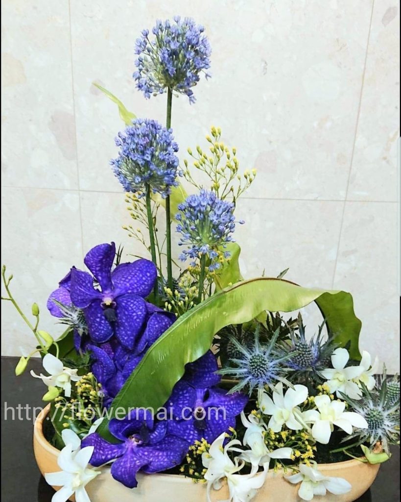 講師資格を持つS様の作品。飾るのはお住まいのマンションのエントランスに。高級感がアップすると住民の皆様にとても喜ばれているそうです?お花もきっと喜んでいるはず。お花の個性を生かしたアレンジです。